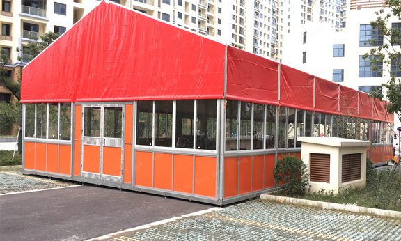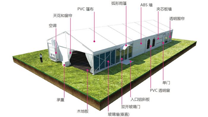 CQ系列小型篷房常規寬度是6米、9米、12米、15米共四種常用尺寸。篷檐高度(邊高)是3米。篷房的結構采用單元組合式設計,長度可按3米間距增加或減少。支架的主要構件(立柱和斜梁)用四槽的122×68×3㎜四槽的高強度氧化鋁合金管材制造,篷布采用阻燃的雙面PVC刀刮布,符合歐洲DIN4102B1、M2標準??酥?/span>650、750、850克/平方米,有遮光和半透光兩種篷布選擇,篷房同樣可以配套ABS墻體、三明治墻體、彩鋼瓦墻體、玻璃幕墻、排水槽等豐富的配置,滿足各種功能需要。