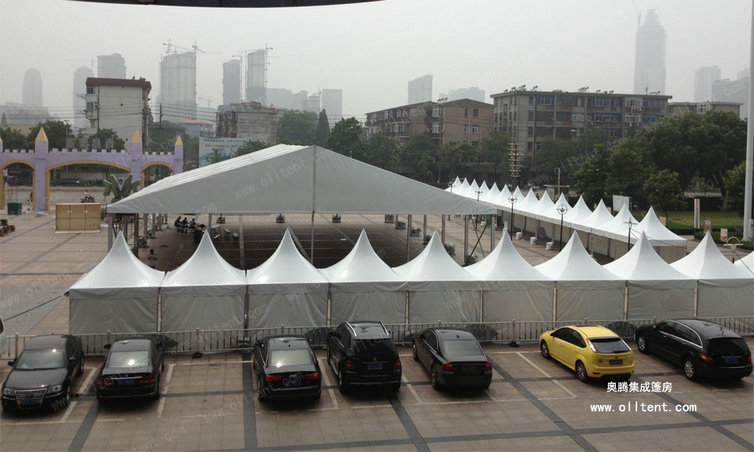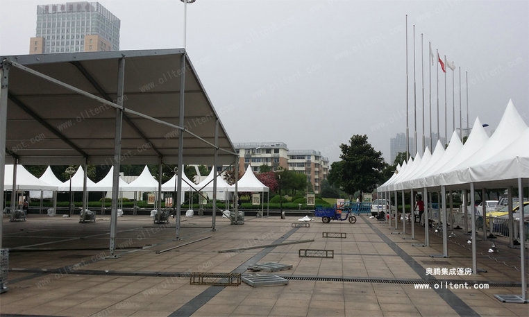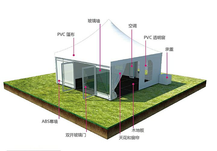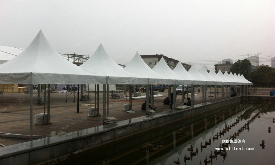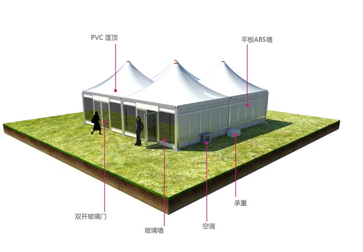 尖頂篷房優(yōu)雅,堅固,潮流,搭建工期短,易于組裝和拆卸。新錐頂篷固定方式,已獲得設計專利證書,新的固定方式,不但大大減少了組裝時間,很好的防止滑出。無需大型機械協(xié)助,單個也可用排水槽連接起來組成更大的面積,形成特殊的造型。