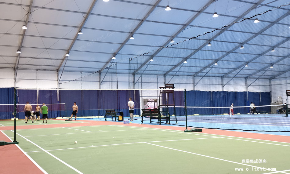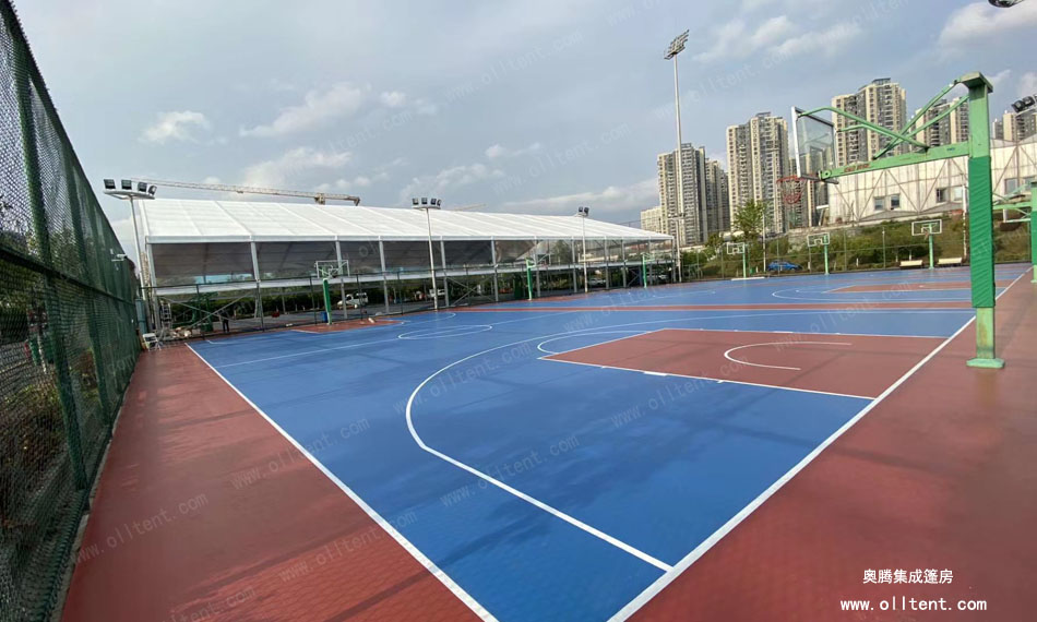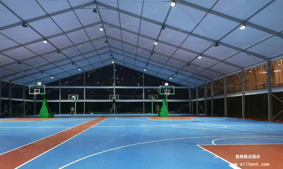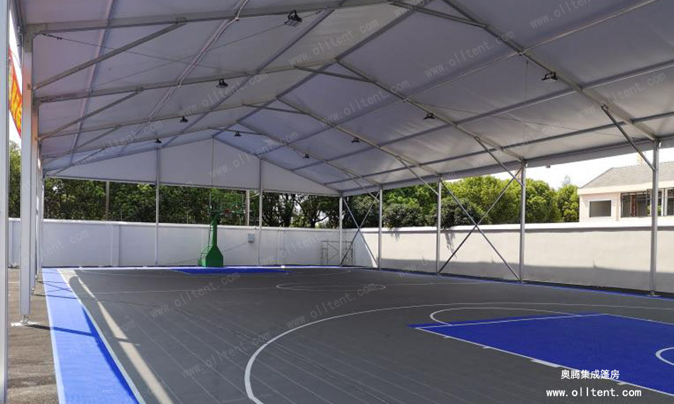 奧騰篷房可以打造各式各樣的籃球場館篷房,跨度從3米至60米,高度從3米到8米,在籃球場館篷房設計外觀上更是多樣化:球形、人字形、弧形等。完全滿足網球、足球、羽毛球、游泳等體育活動對場館的需求。